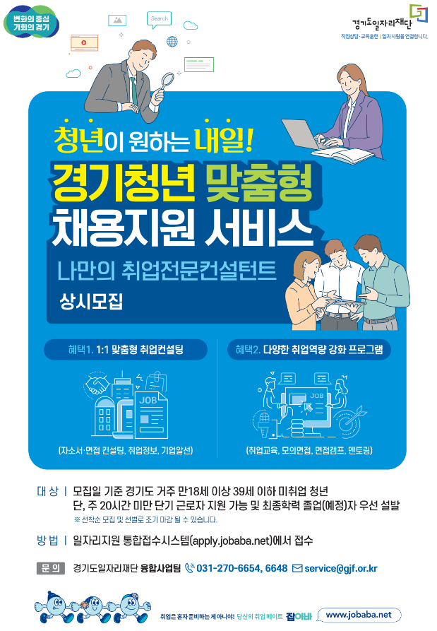 젊은이들이 원하는 내일! 경기도 청년맞춤형 채용지원사업 신청기간 24. 6. 10.(월) ~ 8. 9.(금) 23:59 ※ 모집이 완료되면 신청이 조기 마감될 수 있습니다. 대상 : 도내 미취업자 청년(18~39세) ※ 참여청년의 20% 이상인 고졸자 우선배정, 졸업(예정)자 우선 선발 지원인원 : 100명(선착순 모집 및 선발) – 선착순) 신청방법 : 조바바앱 온라인 신청 지원혜택 – 청년지원사업 정보 제공 – 맞춤형 취업정보 및 취업알선 제공 – 1:1 취업상담사 배정 – 취업운영 지원 프로그램 – 취업자 사후관리 (지원자에 한함) 제출서류