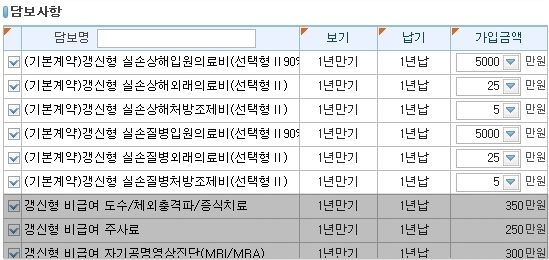 손해보험 책임내역 (자유납부) 보상한도청구완료 (~2009.07) 5,000원 ​​or 10,000원 ​​(상품,약관/보험증권 상이) 100,000원 ​​300,000원 ​​500,000원 ​​2017.03 MAX (10,000원, A급여의 10%) +급여 20%) 25만원 20만원 2017.04~2021.06 MAX (2만원, A의 30%) 1년 (보험연도에 따름) 300만원 한도 2021.07~ (4세대) )MAX (3만원, 30 % of A) 연간 3,000,000원 ​​(보험연도 기준) 비고* A: 의료비 보상