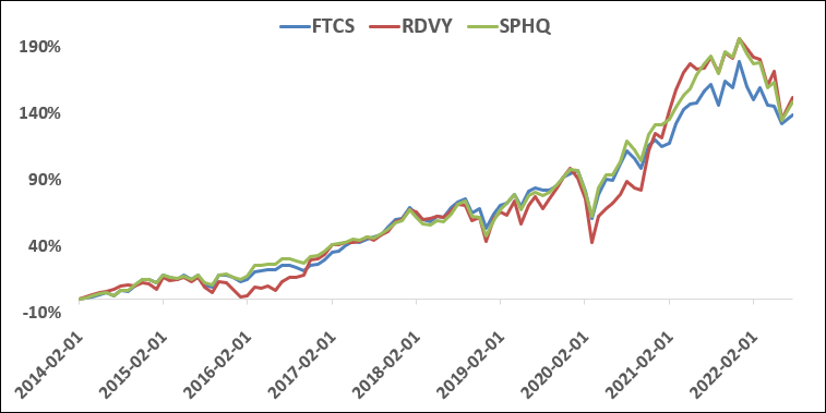 약 10년 전인 2015년에 10,000달러를 투자했다면 지금은 얼마를 벌었을 것입니까? 모든 배당금이 재투자된다고 가정합니다. (1) RDVY: $35,186 – 평균 연간 수익률: 13.53% – 최고 실적 연도: 37.70% – 최대 손실률: -28.28%(2) SCHD: $30,490 – 평균 연간 수익률: 11.90% – 최고 실적 연도: 29.87% – 최대 손실 (드롭): -21.54%(3) DGRO: $30,915 – 연평균 수익률: 12.05% – 최고 실적 연도: 29.87% – 최대 손실률: -21.92% 장기 투자 관점에서 보면 RDVY가 가장 높은 수익률을 기록했습니다. 하지만 RDVY는 다른 비교 ETF에 비해 높은 변동성을 보여주기 때문에 안정적인 수익률을 선호한다면 SCHD나 DGRO가 더 나을 수도 있습니다.