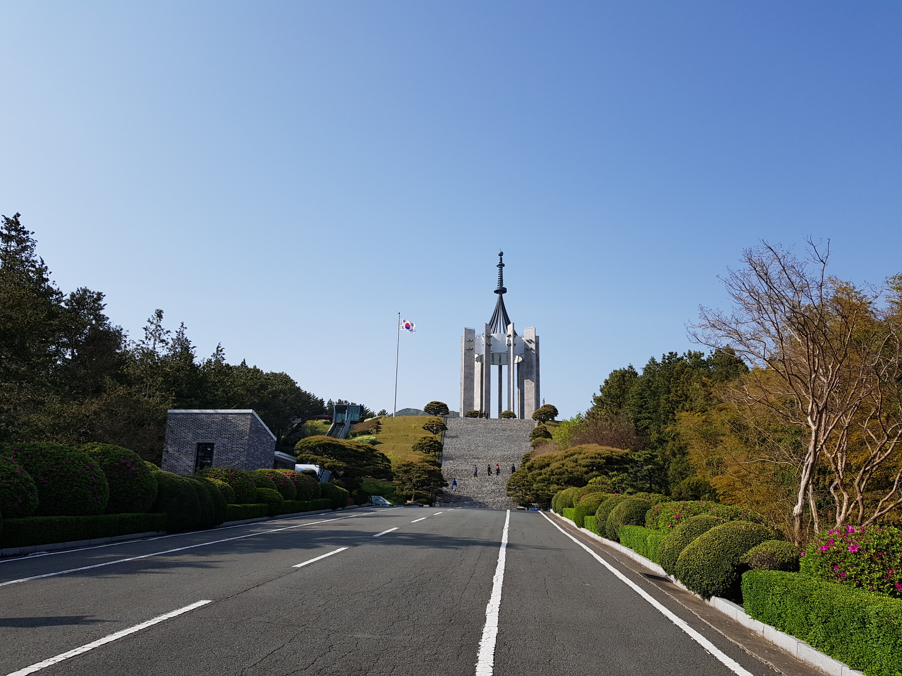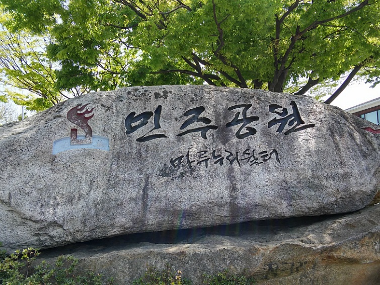올라가서 길 건너 민주공원의 풍경을 내려다보세요.