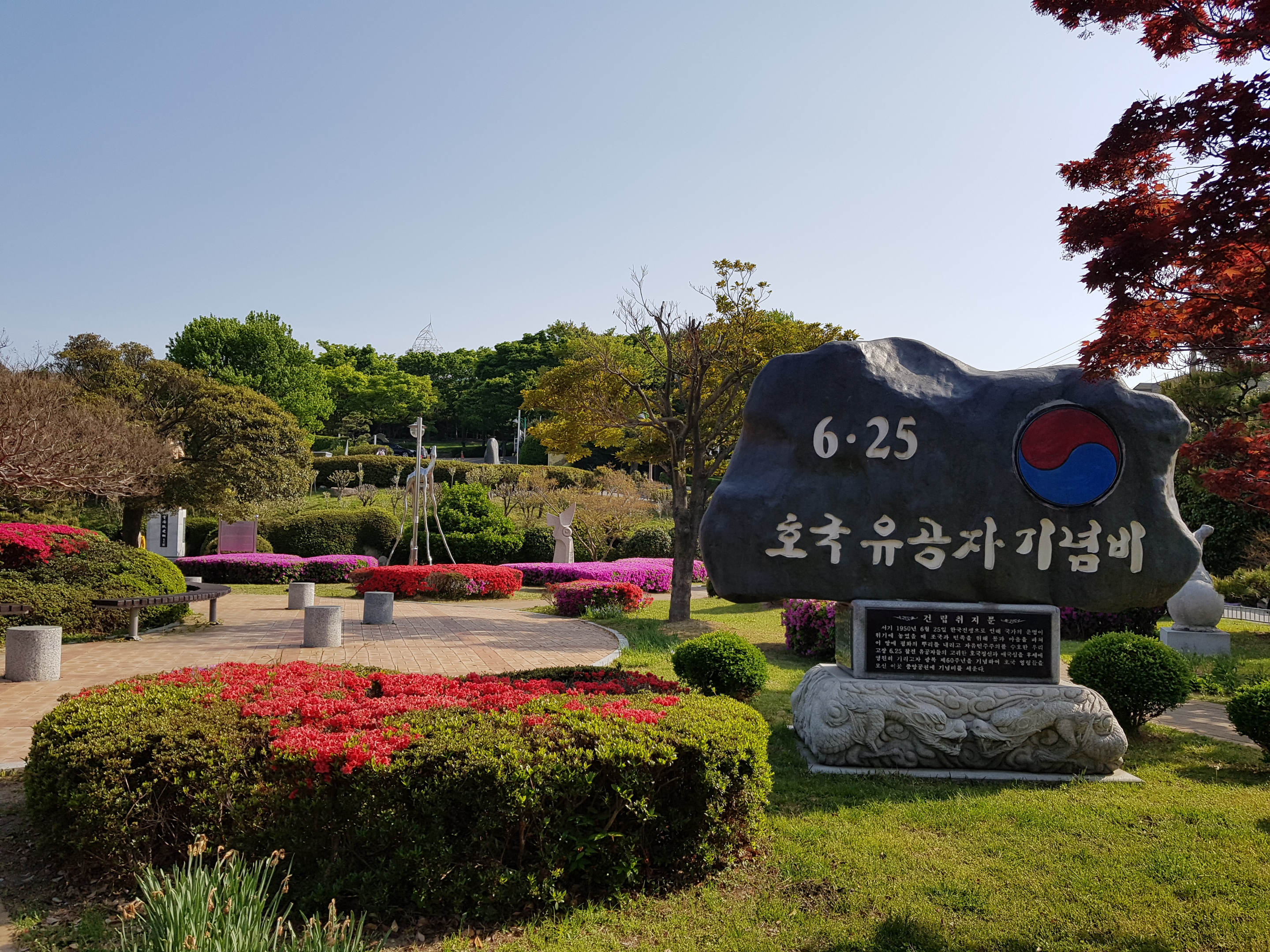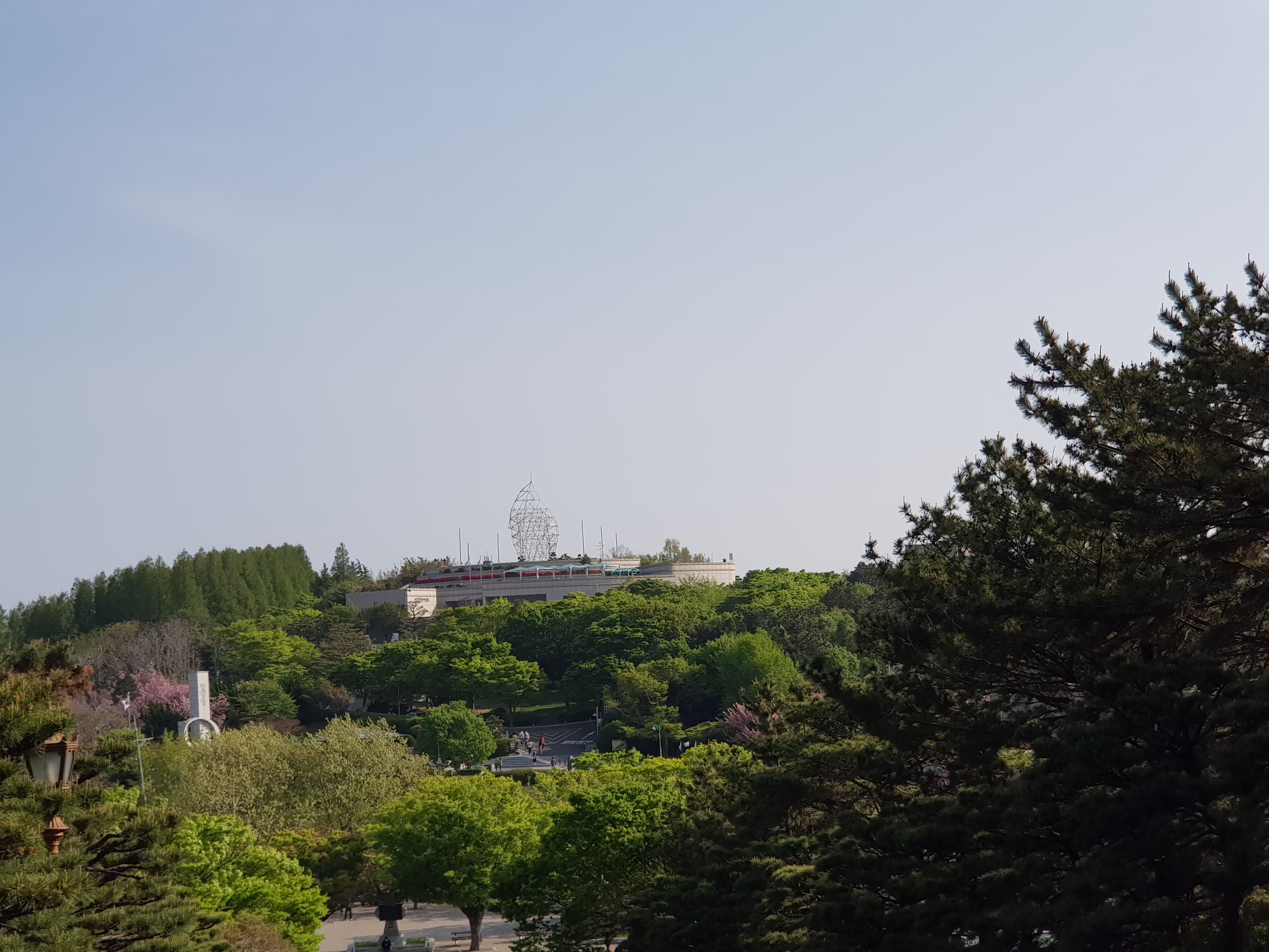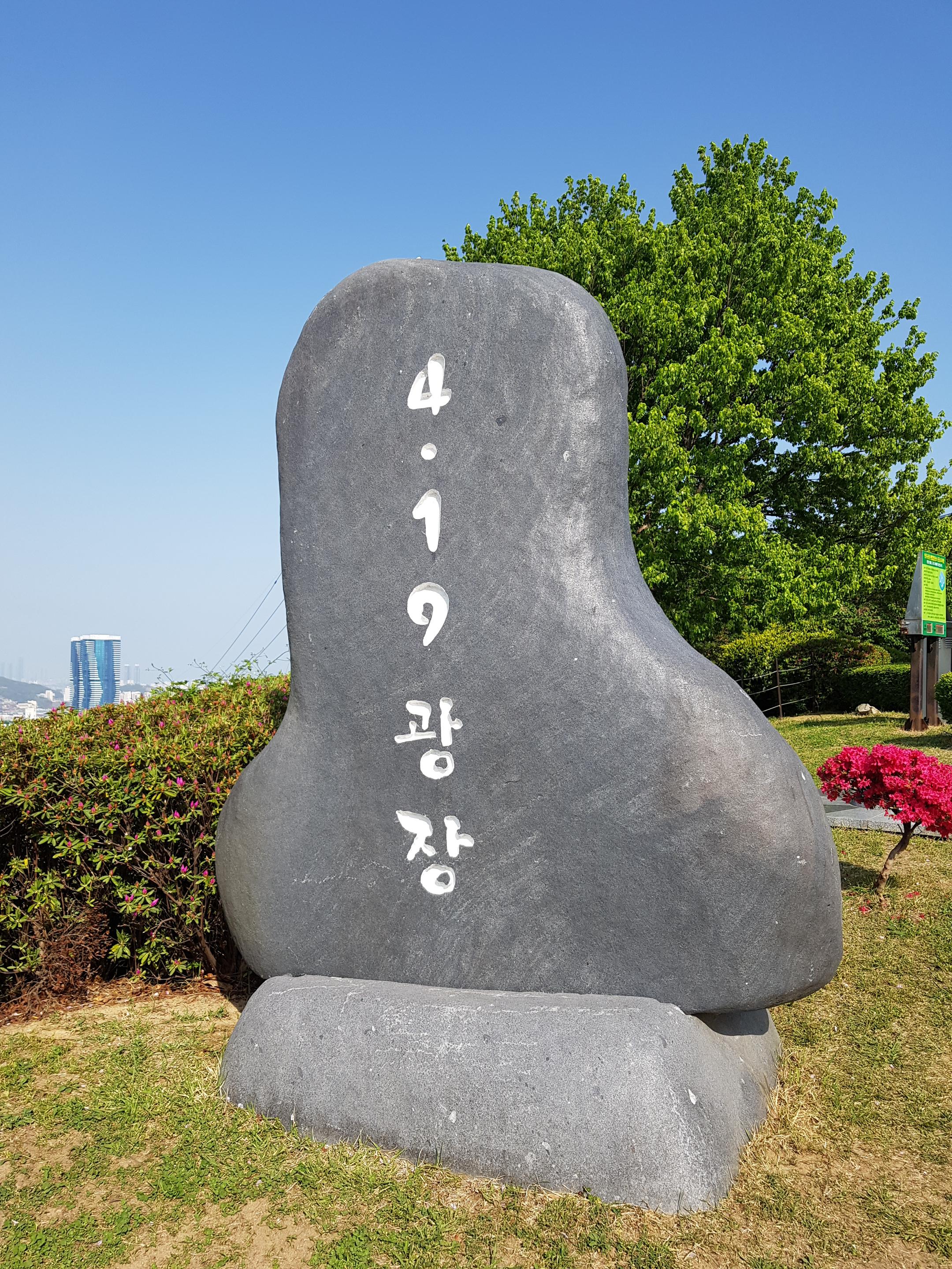 올라가서 길 건너 민주공원의 풍경을 내려다보세요.