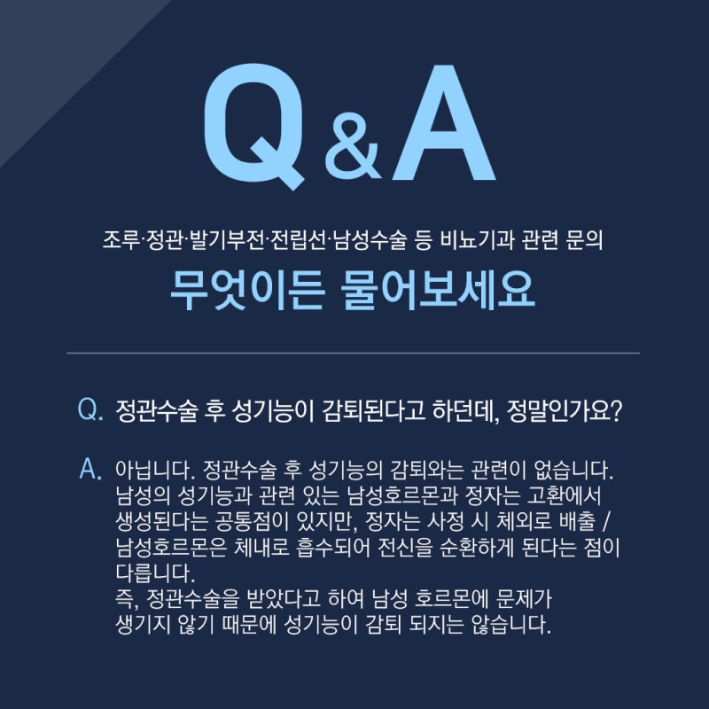 사랑하는 사람과 새로운 가정을 꾸리고 아이의 계획을 모두 이루면 더 이상 아이를 갖지 않아도 되기 때문에 정관 절제 수술을 고민하는 남성이 많습니다. 그리고 나중에 상황이나 마음이 바뀌었을 때 다시 복원할 수 있기 때문에 큰 걱정 없이 시행하는 분들이 계셨습니다. 시술을 할 때 절차도 어려운 편이고 올바른 방법으로 시행하지 않을 경우 생식 기능이 이전으로 돌아가지 못할 수도 있었습니다. 정관 수술은 비교적 짧은 시간에 진행되기 때문에 복원 수술도 그렇지 않을까 생각하시는 분들이 많은데요. 정관의 상태와 난이도에 따라 시간은 달라질 수 있습니다. 따라서 우선 정관수술부터 할 때 부부간의 충분한 대화가 필요합니다.